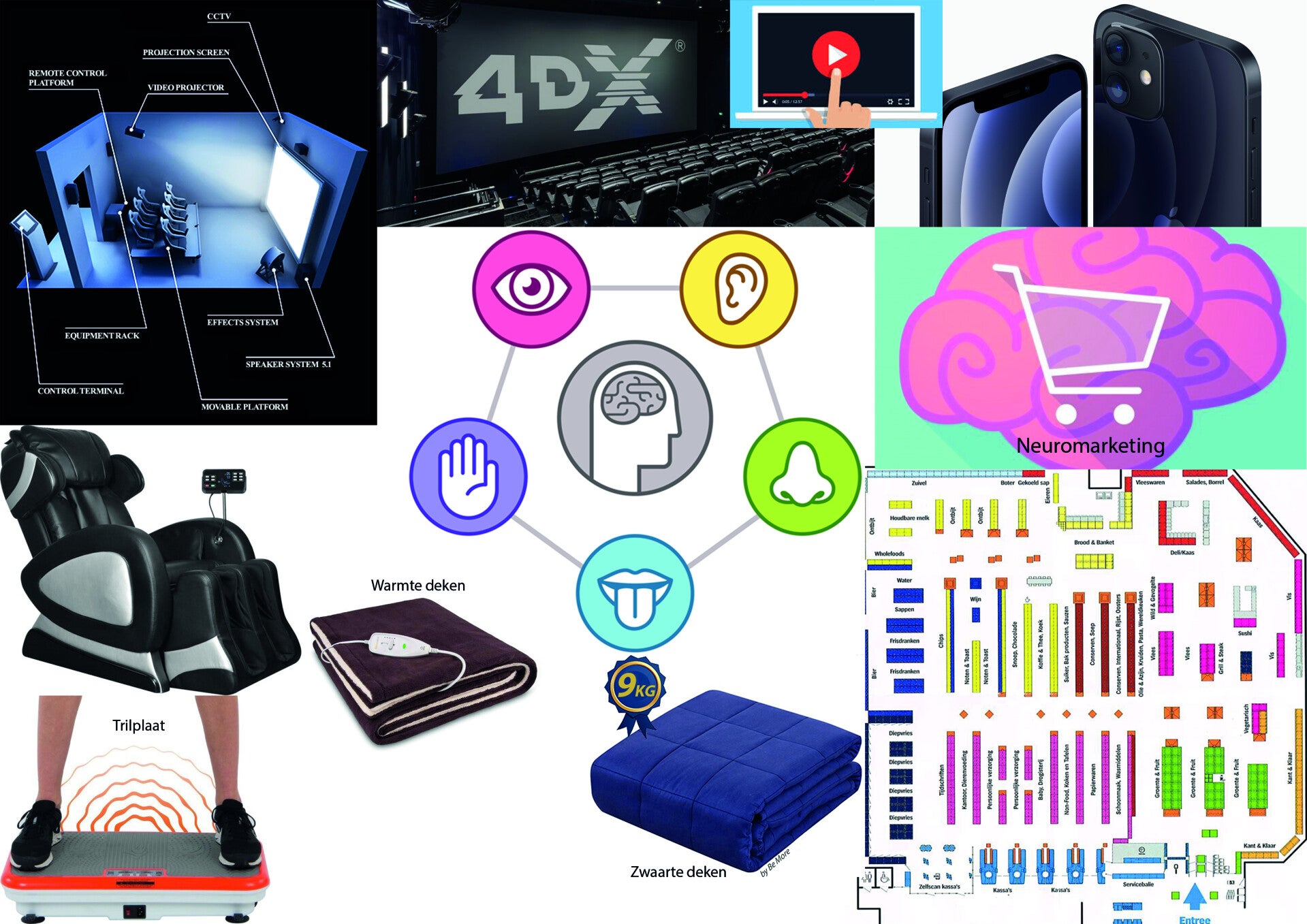 In de rechter onderhoek zie je een supermarktplattegrond. Daarboven staat een afbeelding met de term neuromarketing. Een supermarkt is dé plek waar alle zintuigen met opzet extra worden geprikkeld. Van de indeling van de supermarkt tot de muziek en de snelheid daarvan tot de lichtintensiteit. Er wordt alles aan gedaan om jou op je gemak te laten voelen en om je tempo te verlagen. Alles zodat je meer gaat kopen.